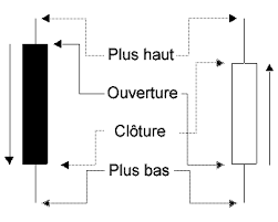 En 1755, Munehisa Homma a ainsi mis en lumière dans son ouvrage 'The Fountain of Gold' l'aspect essentiel de la psychologie sur les marchés, les émotions des traders ayant clairement une influence sur leur comportement et donc sur les cours.L'emploi de ce mode de représentation reste toutefois relativement récent sur les marchés financiers occidentaux. Ce système a été popularisé au début des années 1990 par un l'analyse américain Steve Nison, auteur d'un ouvrage devenu une référence en la matière : 'Les Chandeliers Japonais'. Tout est parti d'une rencontre avec un courtier japonais qui utilisait cet outil pour analyser le marché, ce qui lui a donné envie de faire des recherches poussées afin de pleinement comprendre et maîtriser cette approche.Ce rappel historique effectué, passons à présent aux aspects concrets. Voici les quatre données utilisées pour représenter visuellement l'évolution d'un cours :Lorsque le cours de clôture est supérieur au cours d'ouverture, le corps de la bougie est blanc (ou vert) et on parle alors d'énergie positive (yang) car le courant acheteur a dominé les échanges.